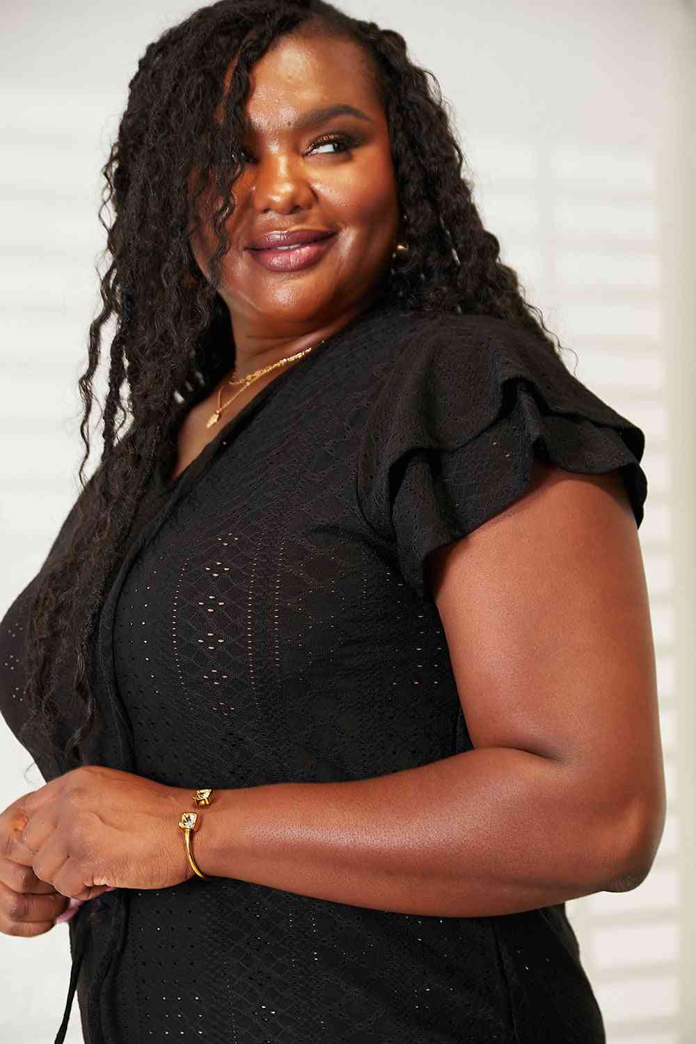 Elevate your style with this stunning Eyelet Flutter Sleeve Blouse. The intricate eyelet design and flutter sleeves give a feminine and whimsical touch, while the tie-neck adds a touch of elegance and sophistication.
